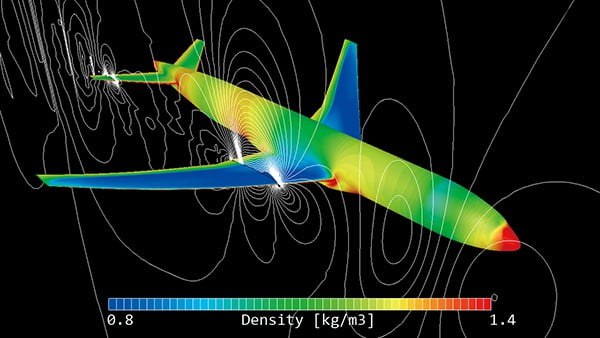 The software can analyze phenomena such as supersonic flow and significant expansion/contraction of volume. For a compressible fluid, both the pressure-based and the density-based Solvers can be used. The density-based Solver keeps the calculation stable even with high Mach number. You can select either Solver depending on the analysis target and phenomenon.